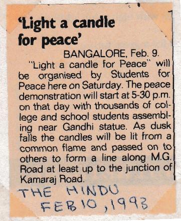 Light a Candle for Peace is a brief event announcement published in The Hindu on 10 February 1993. The notice informed readers about an upcoming peace demonstration organised by Students for Peace, scheduled for Saturday, 13 February 1993, at Mahatma Gandhi Road in Bangalore.